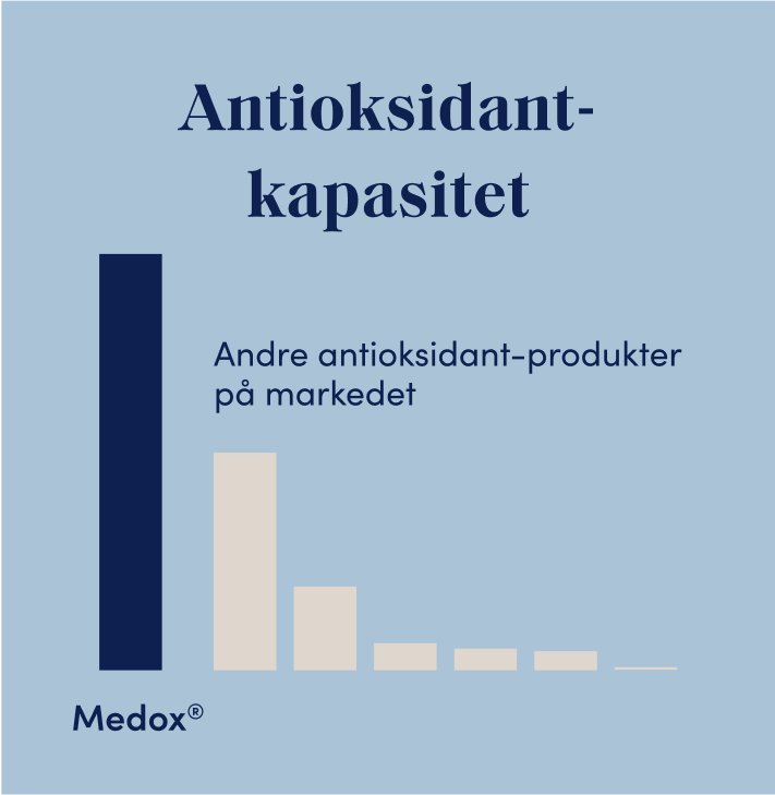 Medox® har nesten dobbelt så høy antioksidantkapasitet sammenlignet med andre antioksidantprodukter på markedet. Det betyr at du får mer igjen for hver kapsel når du velger Medox®.